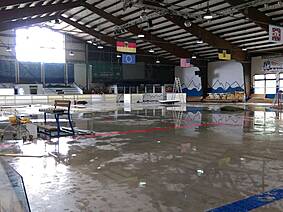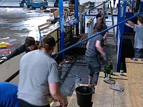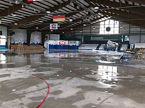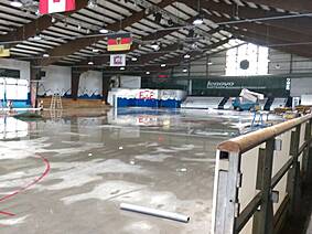 Wie man auf den Bildern unten sieht ist die Fläche noch nicht mal vollständig getrocknet, trotzdem haben es rund 30 unermüdliche Helfer in kürzester Zeit geschafft die Bande, Netze, Zeitnehmer-Box, Spielerbänke, etc. abzubauen und das Icehouse einer großen Lagerhalle ähneln zu lassen. Der besondere Dank gilt dabei neben Fritz Haaf (dem Vorstand des ECE) vor allem der 1. Mannschaft der Eisbären sowie den Rhein-Neckar Gladiators. Denn die Gladiators haben sich dabei hauptsächlich dem Bandenabbau angenommen, damit Sie diese im Gegenzug unentgeltlich übernehmen und auf Ihrem eigenen Hockey-Platz in Ketsch wieder aufbauen können. Da ursprünglich als einzige Alternative die Verwertung der einzelnen Banden-Bestandteile im Raum stand, haben wir mit dieser Option für alle die bessere Lösung gefunden! Denn so wie die SAP-Arena den ECE mit der Bande unterstützt hat, konnte dies nun der ECE für die Gladiators tun.